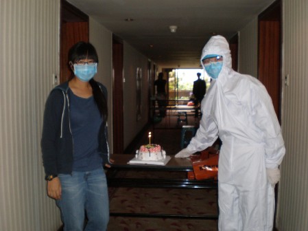 三 在留验区,医疗队员日常的医疗工作就是为留验人员一天测四次体温,询问六大症状,并将采集到的信息报送給有关部门,这看似简单的工作在这种特殊环境中却显得异常艰难,除了要安抚情绪激动的留验人员,使他们配合工作,还要严格按照标准二级防护来穿戴手术衣、防护服、隔离服,戴防护眼镜、N95口罩、双层手套及鞋套来进行操作,为了节省时间和材料,肖瑛护士长和大家一起尽量延长穿隔离衣的时间,原定四小时换一班的计划因为工作繁忙、人员紧张,往往不能按时实现,隔离衣一穿就是十来个小时,期间不能吃饭、喝水、如厕,面罩摘下来时脸上出现红肿、起泡,脱下手套后汗水顺着手指往下滴……但大家为了完成使命,都毫无怨言,尽职尽责的工作。 医疗队在留验区另一项重要工作就是照顾好留验人员的生活起居,由于11名留验人员来自不同国家,生活习惯和对居住、饮食条件的要求大不相同,加之在留验期间心情烦躁,往往提出各种苛刻的要求,张玲霞副院长作为协调组的总指挥,都给予最大程度的满足,尤其是来自日本的留验人员,刚来时提出房间光线不好,医疗队员就请人为他换了大功率的灯泡,提出固定电灯开关不方便,又配备了台灯,提出电视信号不好,想要上网,就配备了笔记本电脑和无线网卡,还要求为他提供热水器、咖啡、吹风机、浴巾、拖鞋等等,张玲霞副院长和郑策主任医师都不厌其烦的一一协调落实,一趟一趟的跑出去为他们购买所需。留验人员的三餐都是由护理人员挨个问过每个人每一餐想吃什么之后,告诉工作人员并详细登记在卡片上,按照要求分别提供。觉得饭菜不合口味,要在外面的饭店订日本料理、牛扒餐,都要通过检疫部门的检疫方能进入留验区,张玲霞副院长还专门挑选能通过检疫的带皮水果提供給留验人员。对于如此繁琐甚至于折磨人的要求,我们的医疗队员都尽量从留验人员的处境和心情考虑,为他们尽可能的多想一些、多做一些,在六合彩生肖医疗队人员无微不至的照顾下,留验人员的情绪从初来时的暴躁不安逐渐转为平静,和医疗队员的关系也越来越融洽。 5月15日上午,护理人员在送早餐时,一名美籍华裔女士提出,今天是她同在一处留验的女儿王路的20岁生日,能不能为她做一碗长寿面。得知这一信息,郑策主任医师和张玲霞副院长商量后决定,除了长寿面之外,再为这个20岁的花季少女订做一个生日蛋糕,经过征求王路母亲的意见,大家决定事先不告诉她,給她一个惊喜。蛋糕订做回来之后,后勤工作人员杜默闻自告奋勇:“让我把蛋糕送进去,把蜡烛点上,再给她唱首生日歌,让她过个有意义的生日”。为了将蛋糕和长寿面送到王路面前,杜默闻穿上防护服,将蛋糕和长寿面送到走廊,肖瑛护士长将闫璐请出房间,见到生日蛋糕和长寿面的闫璐既惊喜又意外,在一旁的肖护长和小杜轻轻唱起了生日歌,“路路,祝你生日快乐,吹蜡烛许个愿吧!”王路感动的热泪盈眶,连声道谢。虽然环境特殊、条件简陋,但王路却度过了一个难忘的20岁生日。 经过五天的努力奋战,所有的留验人员均无出现异常,四名加拿大籍留观人员于15日下午2:30分安全解离,离开了留验区,16日凌晨1:30分,其余留验人员也顺利解离,三名美籍华人于当日凌晨离开留验区,剩下的四名日本人于16日早上8:30离开留验区,每一批留验人员解除留验时,省卫生厅杨芙英副厅长、市卫生局秦鸿学局长、冯关力院长等有关领导都亲自到场祝贺并欢送,加拿大籍华裔的一对母女在解除留验时对秦局长说:“长时间在国外生活,这次回来才感受到了国人的温暖,感谢大家的关心和照顾!”日本的四名留验人员临走前深深的向我们的医护人员鞠躬,其中一名72岁的老人几乎将头挨到了地上,嘴里不断说着:“太感谢你们了!给你们添麻烦了!”所有解除留验的人临走时都对我们的医疗队员耐心细致、任劳任怨的工作表达了由衷的感谢,而我们的全部15名工作人员,虽然身体疲惫,但圆满的完成了艰巨任务,每个人的脸上都露出了灿烂的笑容……
