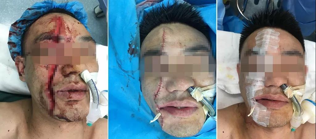 急诊科,经询问,患者是一名31岁的建筑工人,在施工时使用角磨机时不慎弹回,从额部到下巴被全层锯开,连额骨也被锯开了一个大口子,伤口均呈锯齿状,牙齿也露出伤口外,出血明显,非常严重。