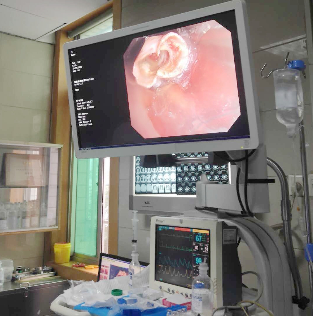 门诊薛刚主治医师认为半年时间此处病灶未完全吸收,并且持续有咳痰症状,建议住院继续寻找病灶不能完全吸收的原因。住院后支气管镜检查追寻病因,镜下发现右肺下叶前基底段异物堵塞管口,管口狭窄,有肉芽组织增生。气管镜下钳取异物未成功,在董玉主任指导下,李东繁主任医师,何锴、马阳主管护师应用冷冻技术顺利完整的取出异物,支气管异物居然是2cm辣椒,肺炎的元凶终于找到了。