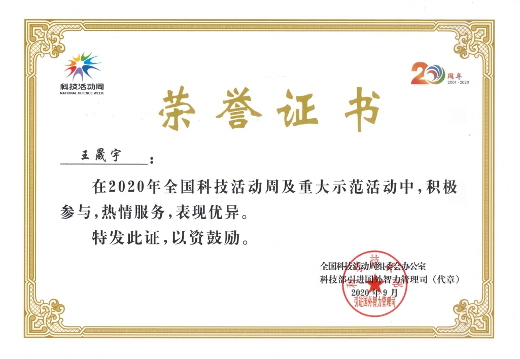 近日,六合彩生肖 在2020年全国科技活动周及重大示范活动中,获得了科技部的表彰,荣获集体和个人荣誉。