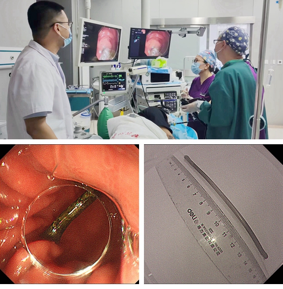 在完善了患者各项术前检查后,由消化科张欣主任医师、马清华医生、主管护师王滢以及疼痛科郭强主任医师、张超医生在麻醉状态下为两位患者分别进行了内镜下的异物取出,经过两个科室的密切配合最终顺利将两位患者坎墩在胃肠道的异物(铁丝)取出,其中胃内取出的铁丝长约14cm,结肠取出的铁丝长约10cm,内镜手术非常成功,立竿见影,迅速解除了两位患者的痛苦。