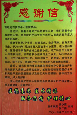 孕妇既往2次剖腹产史,孩子均未成,本次妊娠现32周、全身浮肿一月、心慌气短10天,视物不清、少尿一周。患者系子痫前期重度肾病型、Heellp综合症、心衰、肾功能不全、肝损害,目前表现为全身浮肿、心慌、气短、不能平卧,低蛋白血症致患者大量胸腹水,母子危在旦夕,且胎儿对患者来说又是异常重要!各项检查指标回报全部异常,入院当日22时妇产科程百茹主任申请紧急全院会诊,在医院总值班协调下,各科主任不畏严寒匆匆赶到医院。在带班领导的主持下,对该孕妇的治疗方案及终止妊娠的时机进行了讨论,确定了治疗方案,经过大家10小时的积极治疗,患者的一般状况稍有好转。根据患者情况,产科建议应尽快终止妊娠,院抢救小组就围手术期的优化管理及手术流程行全院讨论后。在各科室的保驾护航下,该患者于1月29日15时在全麻下行剖宫产术,手术顺利,术后患者转重症医学科治疗,在相关科室的协助下进一步治疗,新生儿转新生儿科监护。目前患者病情平稳、恢复良好,已于2月3日转入当地医院进一步康复治疗,新生儿目前正在康复中。2月3日下午,患者家属为医院送来了一封感谢信。