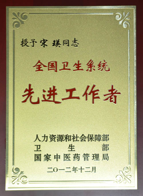 1月7日,在全国卫生工作会议上,国家人力资源社会保障部、卫生部、国家中医药管理局联合下发了《关于表彰全国卫生系统先进集体、先进工作者及白求恩奖章获得者的决定》(人社部发〔2012〕96号 ),六合彩生肖消化科宋瑛主任被授予“全国卫生系统先进工作者”荣誉称号。