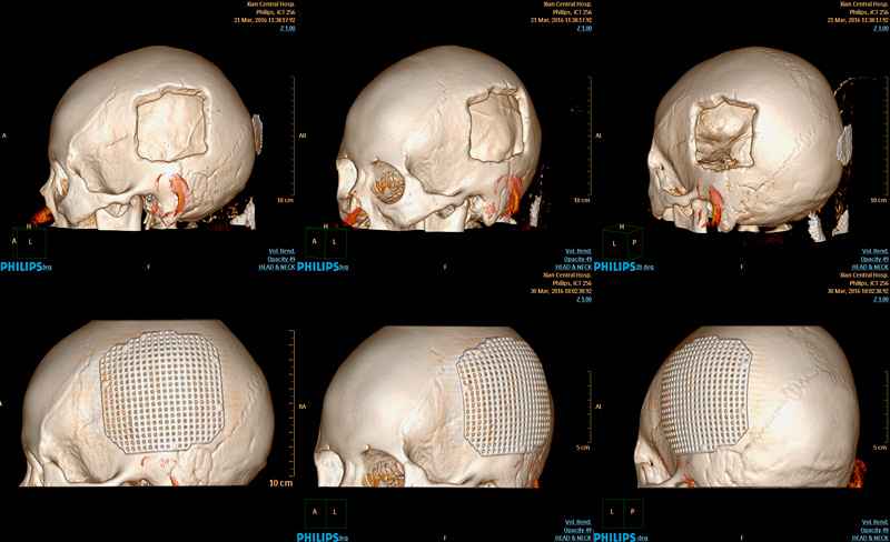 王占尧主任医师接诊后,组织治疗小组认真讨论、分析后认为:该患者病情特殊,手术的同时还需要确保脑组织不被损伤,手术难度较大,再综合分析该患者病情后,决定应用3D打印技术为其打造一副钛网颅骨,经患者和家属同意后,于2016年3月25日为其行颅骨修补术,手术顺利,效果满意。