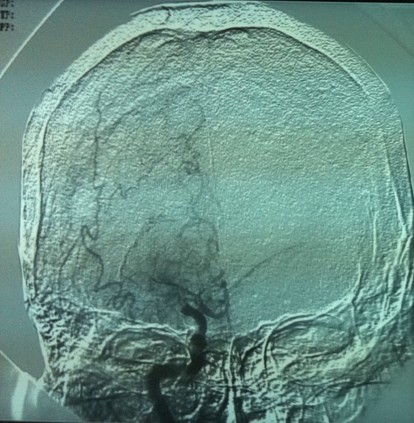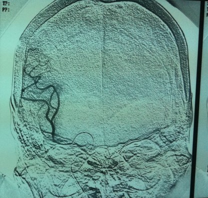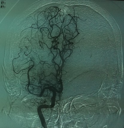 35mg r-tPa溶栓后见右侧颈内动脉开通,大脑前及大脑中动脉显影良好