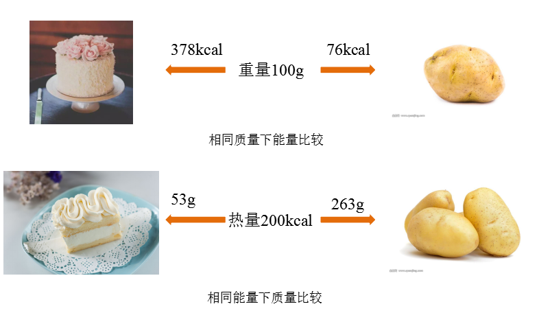 同能量时,土豆在重量和体积上都完胜蛋糕。