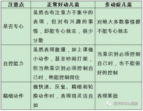 经常有家长提问:“我的孩子除了睡觉总是不停的动,是不是得了多动症?如何区别正常的好动与多动症?”让我们看下表: