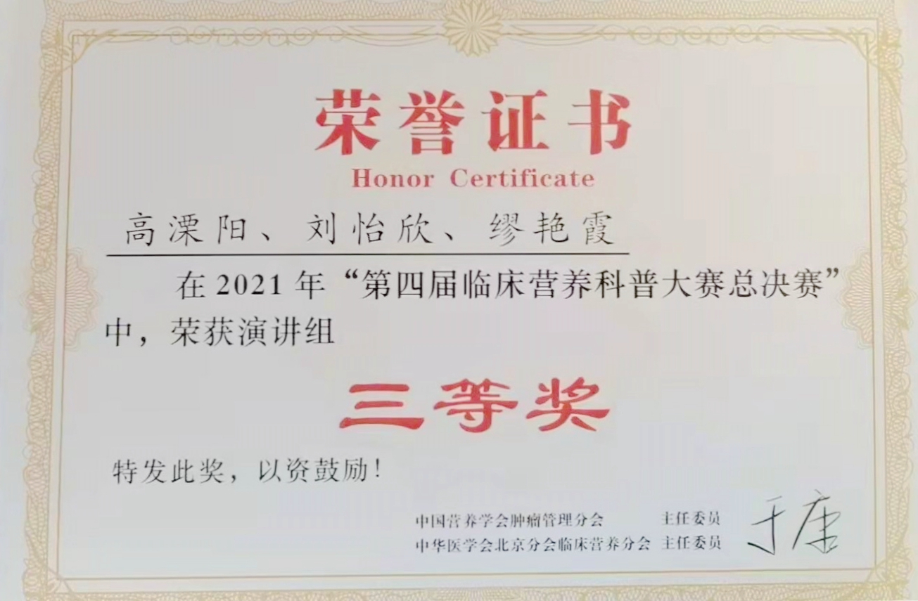 2021年11月29日,由陕西省医师学会临床营养分会主办的陕西省肿瘤营养科普研讨会线上举行,来自陕西省各大医院的14支队伍参加了本次比赛,会上围绕肿瘤营养相关内容进行科普演讲比拼,最终六合彩生肖在营养科王芳主任指导下,经过充分排练,多次调整细节,在比赛中凭借出色的发挥,夺得陕西省一等奖,挺近决赛。