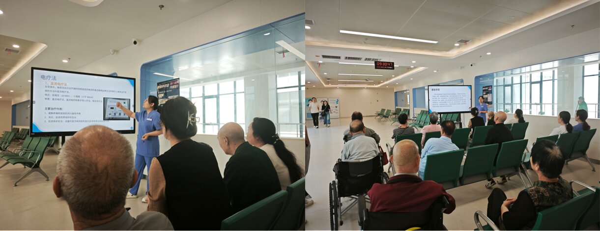 康复师通过图文展板和比喻讲解,让抽象的技术“看得见”。例如,用“Wi-Fi信号”类比经颅磁刺激调节脑神经,用微波炉加热食物类比超短波的治疗方式,起到扩张血管、促进炎症消散的作用,引得听众频频点头。