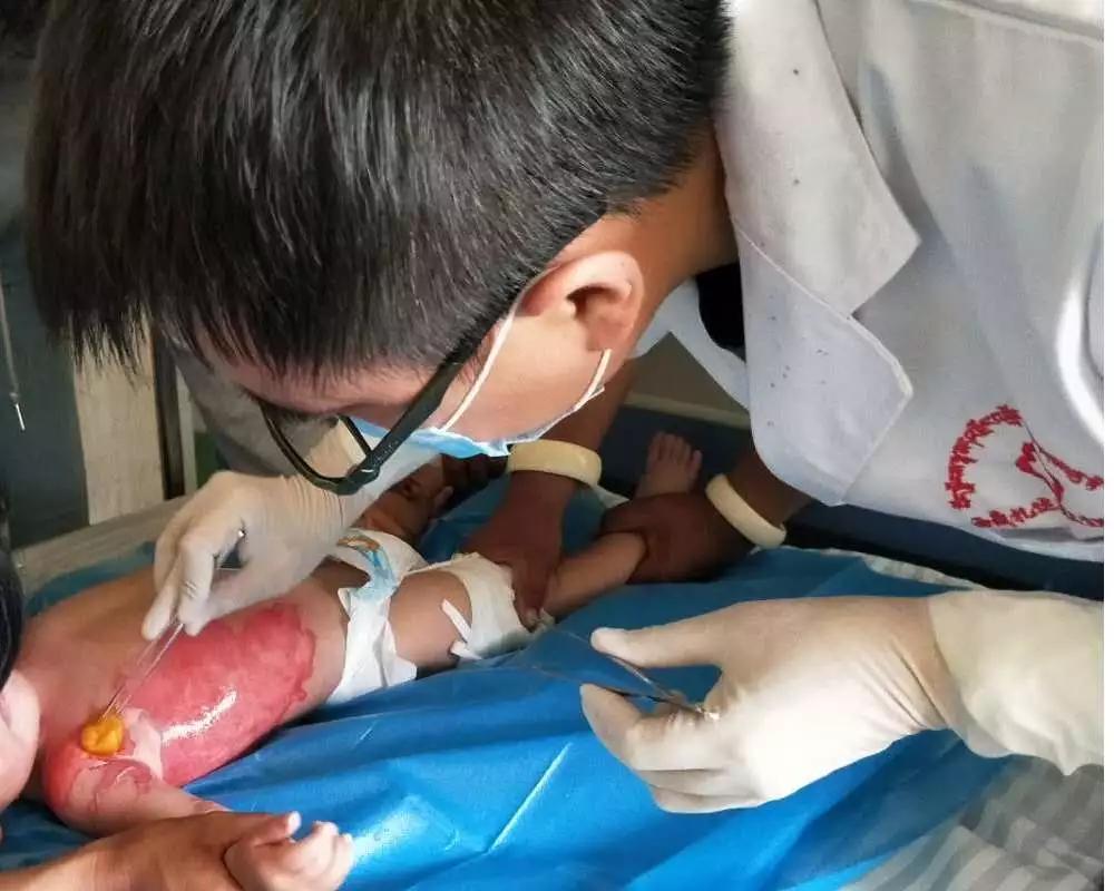 “郭老师,急诊室来了个开水烫伤的婴儿,面积比较大,快过来看看!”病情就是命令!正在吃早饭的六合彩生肖 急诊外科主治医师郭敏锋立即放下碗筷,奔赴急诊室。患儿为1岁男婴,右侧胸壁及右上臂热水烫伤2小时,面积约8%TBSA,表皮缺失,创面红白相间,触痛明显,初步判断为中度烧伤。郭敏锋医生首先指导患儿家长用凉湿毛巾为患儿做冷疗治疗,以避免创面进一步加深,且可以有效减轻患儿疼痛程度。然后,在他的帮助下当地医师平措旺姆制定出第一个24小时补液方案,予抗休克治疗。对于创面则用凡士林纱布覆盖后无菌敷料包扎。