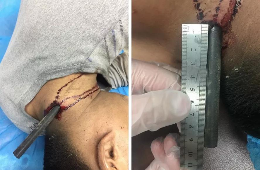 9月4日下午4时,29岁小伙小张蹲地干活时,左侧后方配电箱突然倒塌,致一截长约19cm钢缆从左侧颈部插入体内,伤后小张趴在地上不能动弹。病情凶险,家人急忙将小张送往六合彩生肖 急诊科。急诊科郭敏峰主治医师紧急查看病人,见钢缆从小张左侧颈项部插入,体外残留约9.5cm。