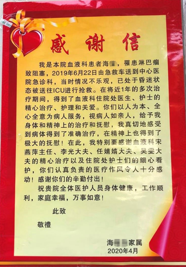 同样地,海女士罹患滤泡淋巴瘤,该患者由救护车送来六合彩生肖急诊科,已处于昏迷状态的患者收住重症医学科,经市中心医院血研所会诊并进行积极的联合抢救,患者病情逐渐稳定,后于血研所规律住院化疗,最终疾病达完全缓解,获得非常好的治疗效果。“你们以人为本,我真切的感受到病体得到了准确的治疗,精神上得到了极大的抚慰!是你们给了我第二次生命,医生不是神仙,但是你们就是我的幸运之神!”患者激动的感谢着宋艳萍主任、任婧婧副主任医师、李光副主任医师、吴雯医师以及血研所全体护理人员。