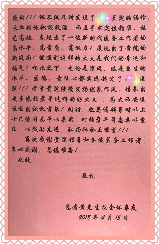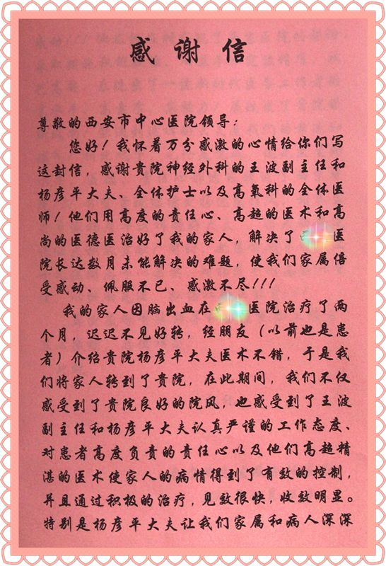 近日,市中心医院收到一封患者感谢信,信中高度赞扬六合彩生肖神经外科王安生主任团队下的王波、杨彦平医生、科室护士以及高压氧科医生,用高度的责任心、高超的医术和高尚的医德医治好了一位转院病人,解决了在西安某三甲医院长达数月未能解决的难题。收到来信后,六合彩生肖立即组织了解患者就医情况,及时发掘身边闪光点,为人民群众提供高超医术和优良服务水平提供标杆。