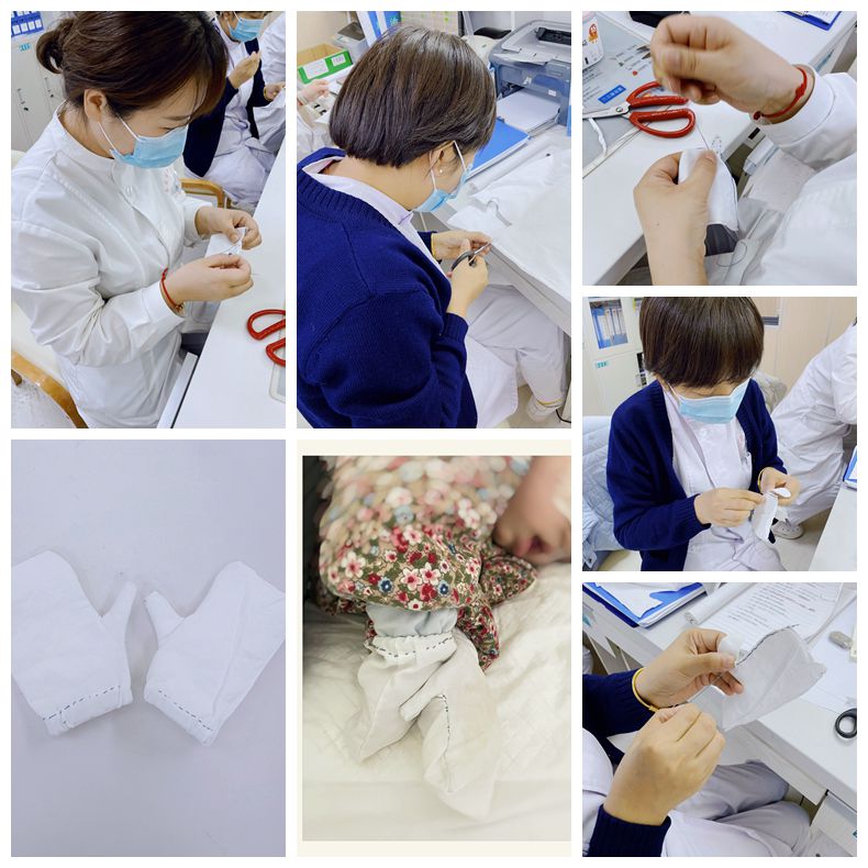 在了解了情况后,考虑到尿不湿长时间包裹不透气,孩子的手会很不舒服。于是,责任护士胡洁、胡晓娜不谋而合的想到用布料给宝宝缝制一双手套。既能防止孩子抓伤眼睛,又能保证孩子手部的舒适性。于是,午休时间她们说干就干,一个描模画样,一个穿针引线,虽手法生疏,但却诚意满满。不到一个小时,一双小手套就戴在了宝宝的小手上。而戴上手套的萌萌心满意足的捧着奶瓶“咕咚咕咚”的喝起奶来,不一会儿就安静地睡着了。看着萌萌稚嫩恬静的睡脸,再看看她手上针脚略显笨拙的手套,大家会心的笑了。回到办公室,两位责护自嘲的说道,虽然针脚粗糙了些,但情意确是细腻无暇的。谁说不是呢!有时候,不完美也很好!