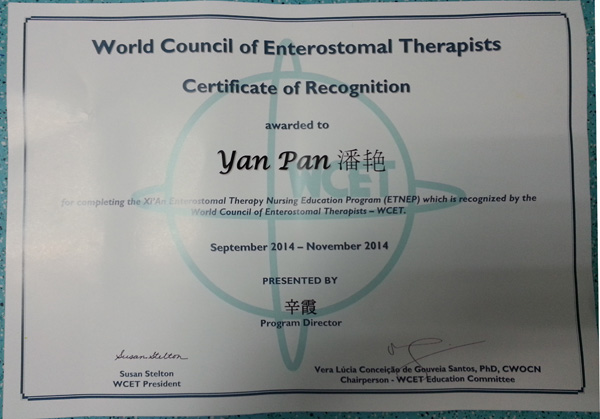 2014年9月至11月,潘艳护士长参加了由西安交通大学医学院国际ET学校组织的为期3个月的专业培训。培训的内容和课程设置严格按国际ET学校要求进行,其中造口护理占40%、伤口护理占30%、失禁护理占18%、专业发展占12%(教学、科研、写作、临床护理),理论和实践均有一定课时要求。经过刻苦学习和严格的考核,潘燕护士长于学习期末取得了国际造口、伤口、失禁治疗师文凭,成为一名合格的国际造口、伤口、失禁治疗师(ET)。ET专业人才的诞生填补了六合彩生肖此项专科护士的空白,也将进一步促进六合彩生肖专科护理的开展和护理质量的提升。