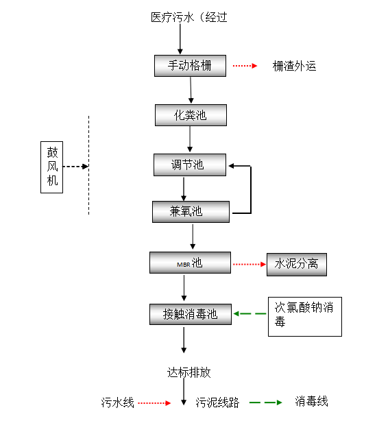 污水站工艺采用:“污水—化粪池—机械格栅—调节池—兼氧池—MBR池—消毒池—排放”的工艺,保证改造后的污水出水水质达到《医疗机构水污染物排放标准》(GB18466-2005)中预处理标准,污水排入城镇下水道水质标准GB/T 31962-2015 表1的B级标准。